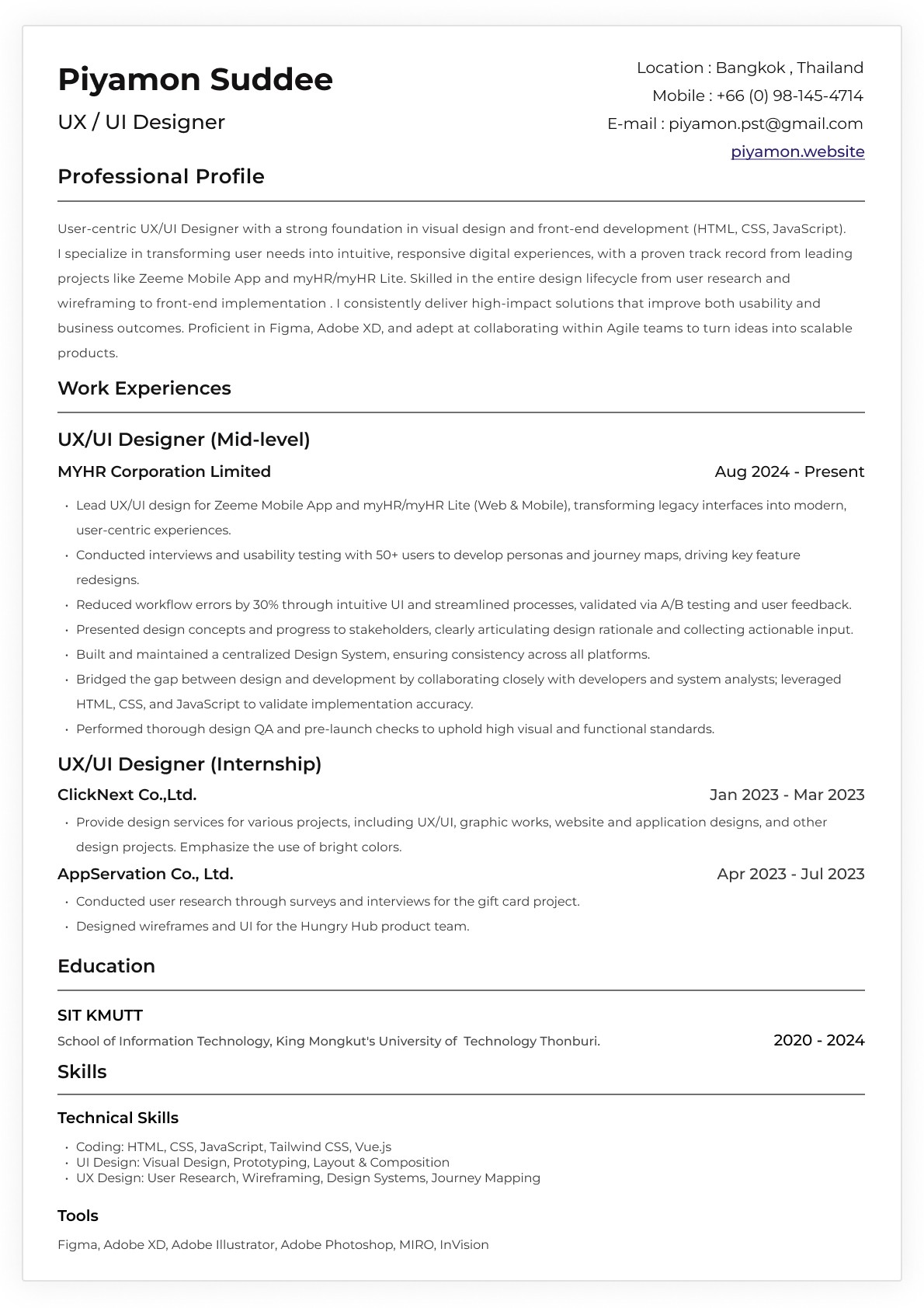 I graduated from KMUTT University, Faculty of Information Technology, and specialize in UX/UI design with strong technical skills in HTML, CSS, and JavaScript.